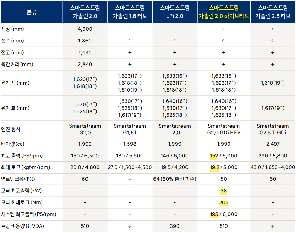 최근에 조사한 쏘나타 DN8 하이브리드 모델의 주요 제원은 다음과 같습니다.