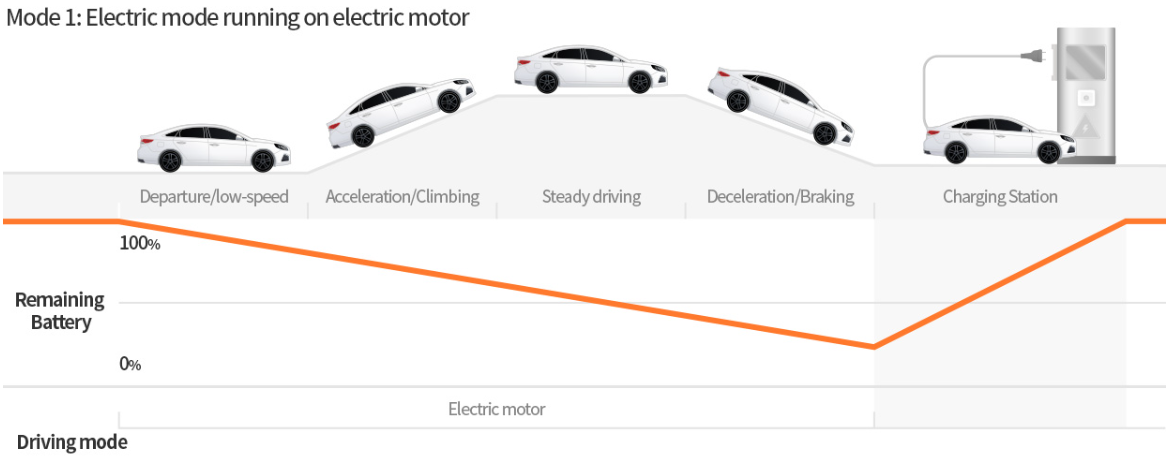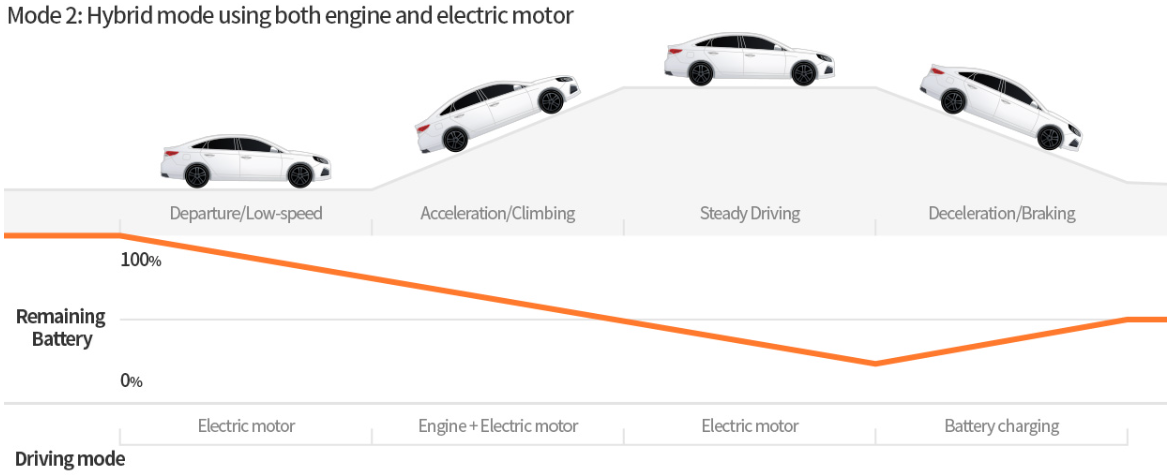 출발과 저속 주행(전기 모터), 가속/경사로 주행(엔진 + 전기 모터), 정속 주행(전기 모터), 감속/제동(배터리 충전)