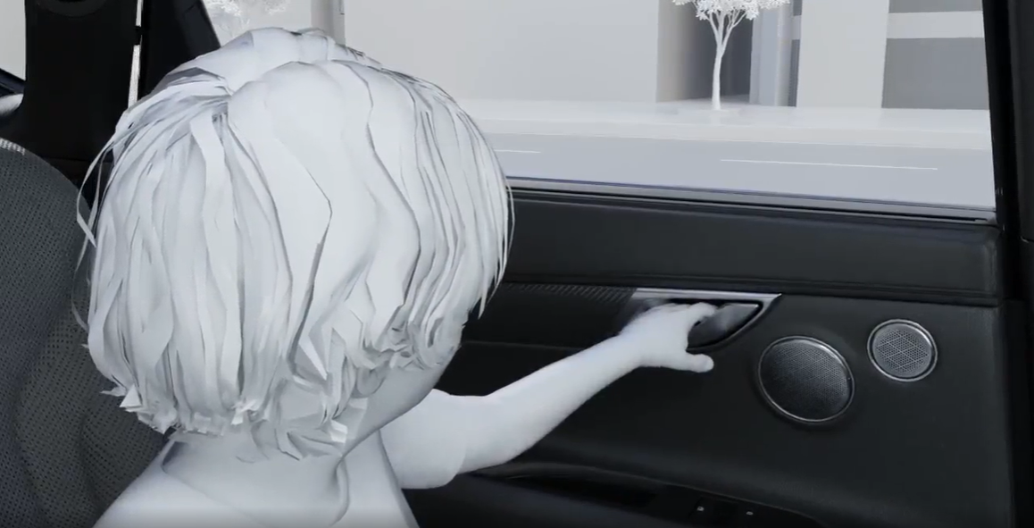 차량이 정차되고 전자 Child Lock 버튼을 눌러 후석 탑승자가 내리는 것을 허용한 상태에서 사각 지대로 접근하거나 사각지대의 차량과 충돌 위험이 감지된 경우 경고하고 문 잠금을 유지합니다.