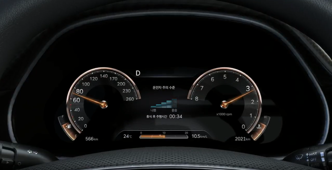 운전 중 운전자의 주의 수준을 분석하고 경고를 제공합니다. 운전자의 주의 수준은 5단계로 표시됩니다. 주의 수준이 Low(Level 1) 보다 낮을 때 휴식이 제안됩니다. 정차 중 앞 차량이 출발하면 운전자에게 경고를 제공합니다.