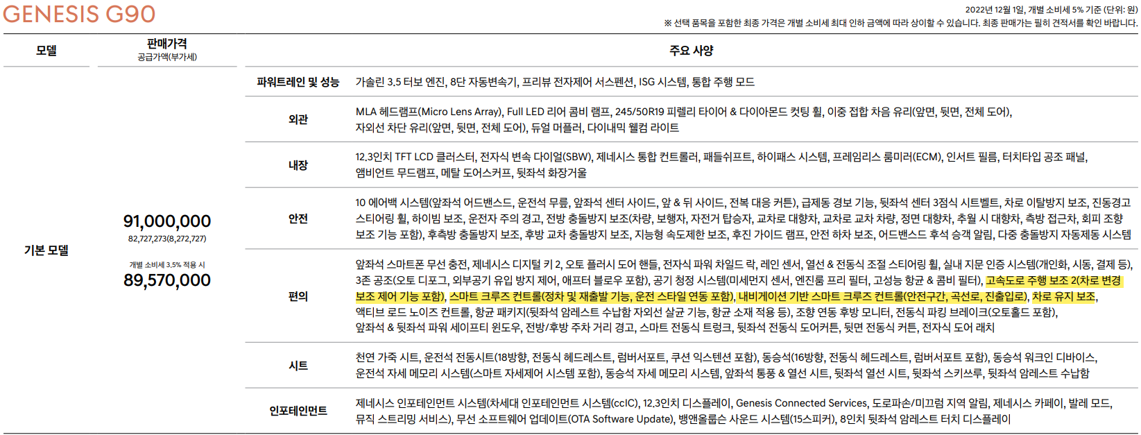 위에서 설명한 내용들을 바탕으로 현대차그룹의 가장 비싼 모델인 제네시스 G90에 적용된 주행 편의 기능을 살펴보도록 하겠습니다.