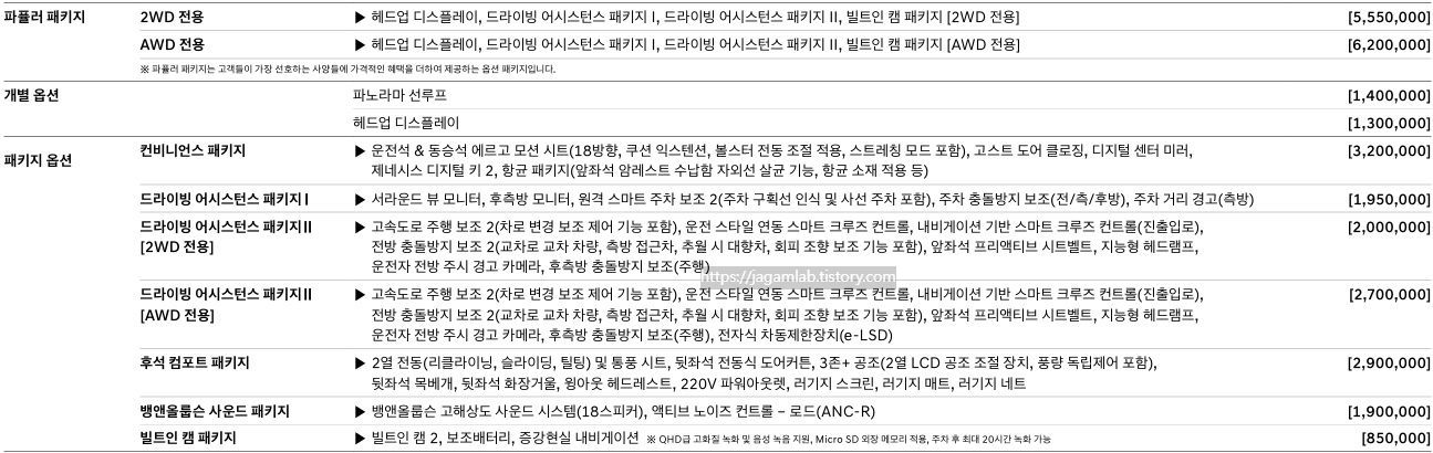 - 파퓰러 패키지(AWD 전용): 620만 원