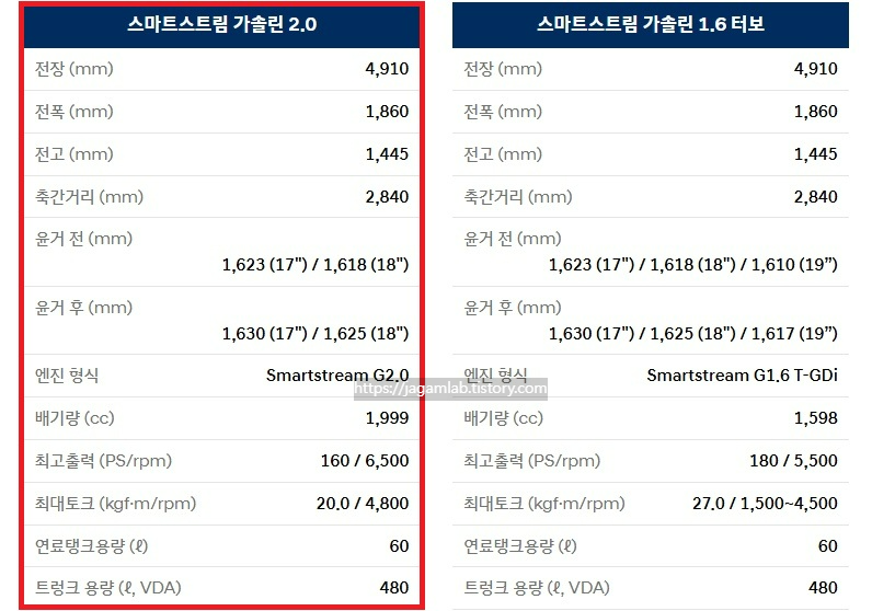 전장 4,910mm, 전폭 1,860mm, 전고 1,445mm 그리고 축간거리(휠베이스)는 2,840mm이며 스마트스트림 가솔린 2.0 엔진과 6단 자동변속기가 조합되어 최고 출력 160마력(@6,500rpm), 최대 토크 20.0kgf·m(@4,800rpm)를 제공합니다. 서스펜션은 전륜 맥퍼슨 스트럿, 후륜에는 멀티링크가 적용되며 연료탱크 용량은 60L입니다.