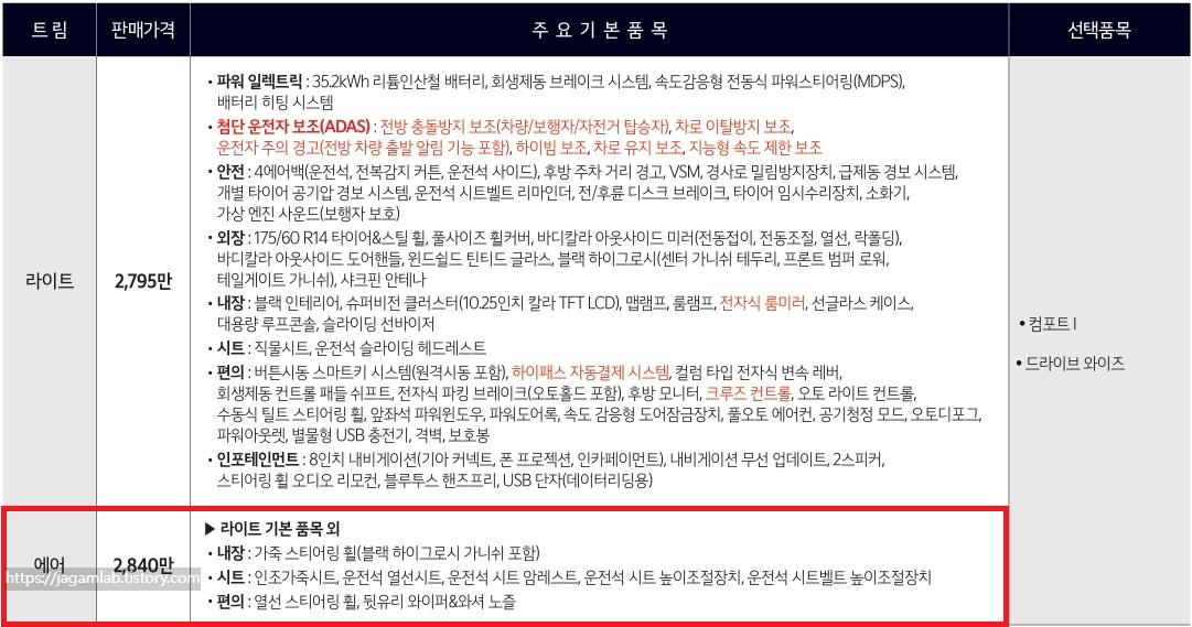 라이트와 에어 총 2개 트림이 있으며 판매 가격이 가장 높은 '에어' 트림은 2,840만 원입니다. 레이 EV 모델은 캐스퍼 일렉트릭 모델과 달리 개소세 할인이 적용되지 않습니다.