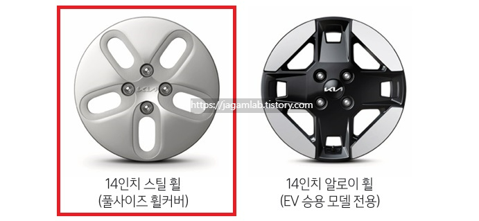 14인치 스틸 휠(풀사이즈 휠 커버)과 175/60 R14 타이어가 적용됩니다.