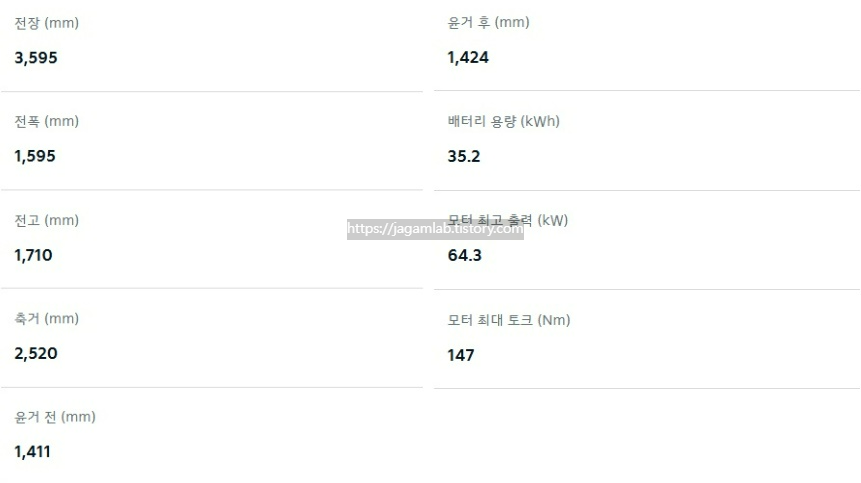전장 3,595mm, 전폭 1,595mmm, 전고 1,710mm 그리고 축간거리(휠베이스)는 2,520mm이며 64.3kW 전기 모터와 35.2kWh 리튬인산철 배터리가 조합되어 최고 출력 64.3kW, 최대 토크 147Nm를 제공합니다. 배터리 충전 시간은 150kW 급속충전기 80% 충전 기준 40분, 7kW 완속충전기 100% 충전 기준 6시간이 소요됩니다. 서스펜션은 전륜 맥퍼슨 스트럿, 후륜에는 토션빔이 적용됩니다.