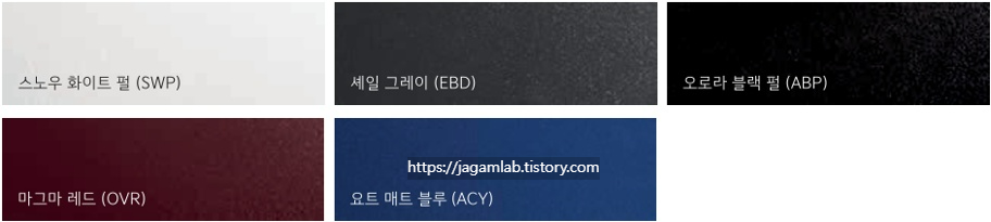 스노우 화이트 펄(SWP), 셰일 그레이(EBD), 오로라 블랙 펄(ABP), 마그마 레드(OVR) 유광 컬러 4종과 요트 매트 블루(ACY) 무광 컬러 1종 중 선택할 수 있습니다. 스노우 화이트 펄(SWP) 컬러 선택 시 8만 원, 요트 매트 블루(ACY) 컬러 선택 시 30만 원이 추가됩니다.