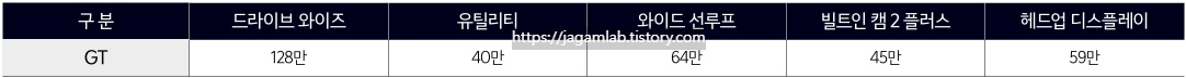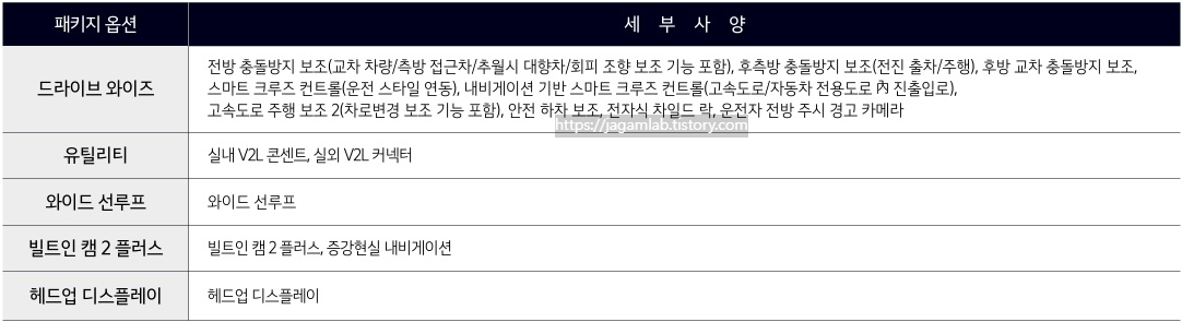 풀옵션 사양 선택 시 드라이브 와이즈, 유틸리티, 와이드 선루프, 빌트인 캠 2 플러스, 헤드업 디스플레이 품목의 가격이 추가됩니다.