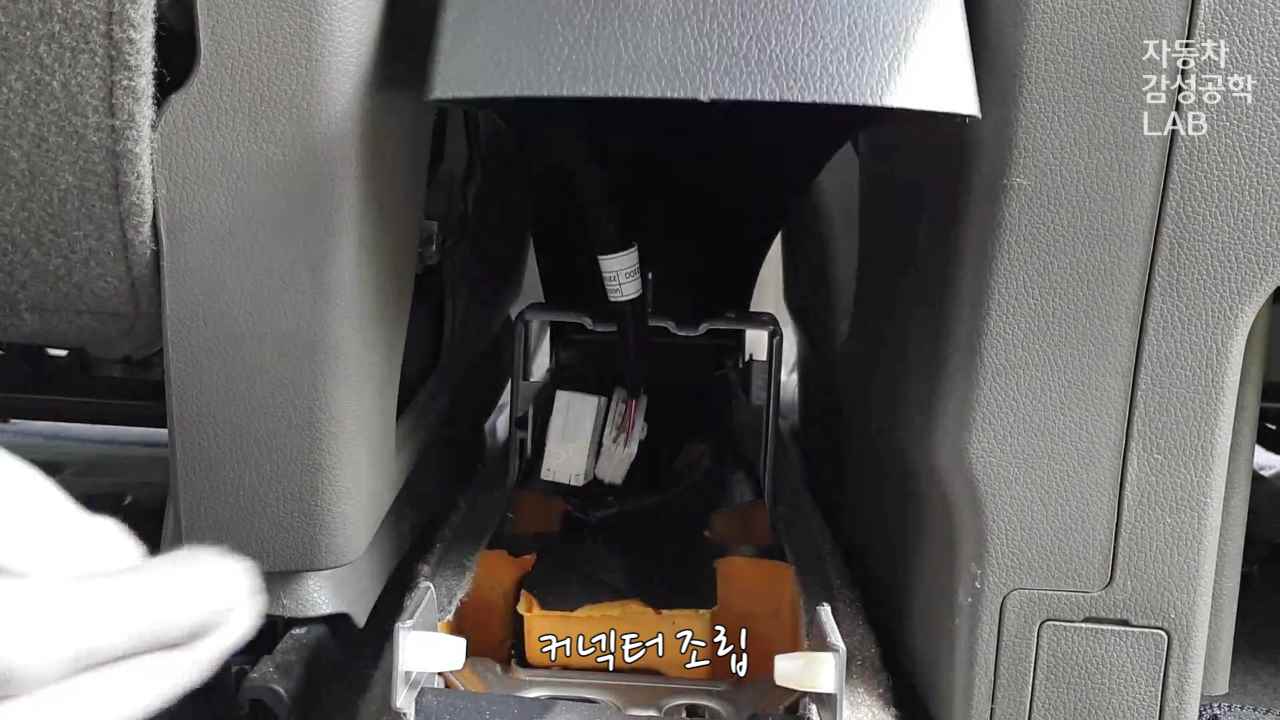 플로어 콘솔을 탈거하면 10mm 너트 조립부와 하네스가 보입니다. 하네스에는 파워 아웃렛용 PIN 2개가 적용되어 있어 작업이 용이합니다.