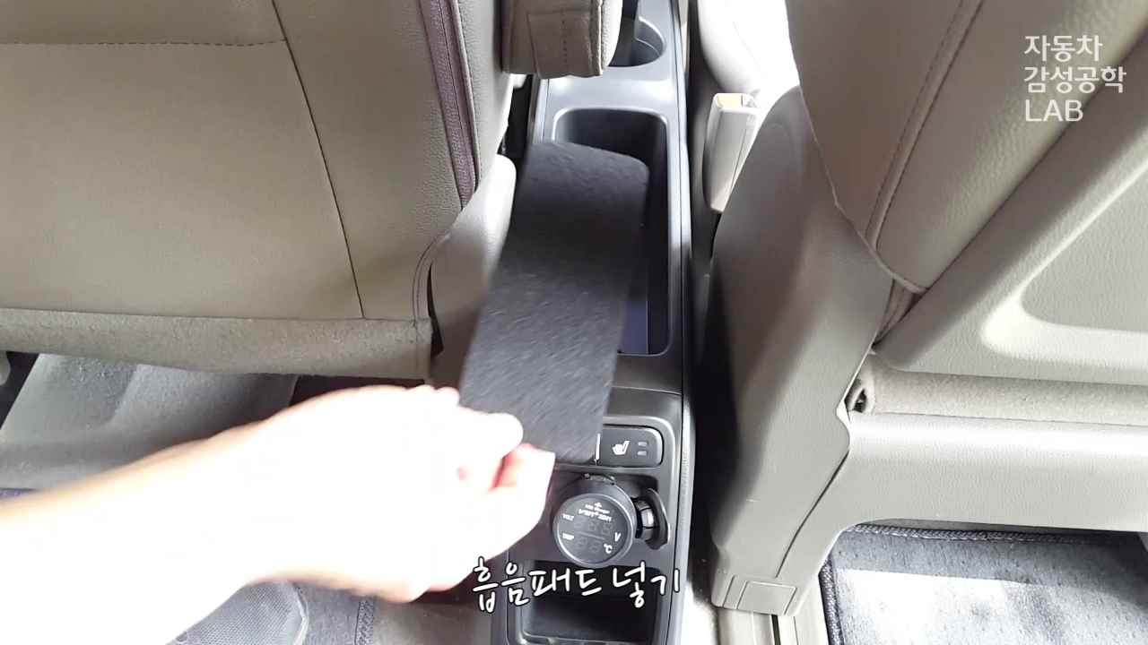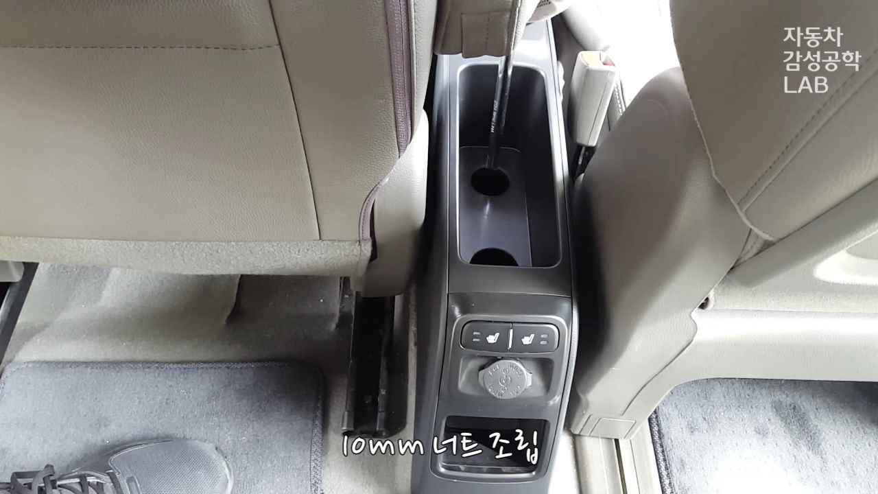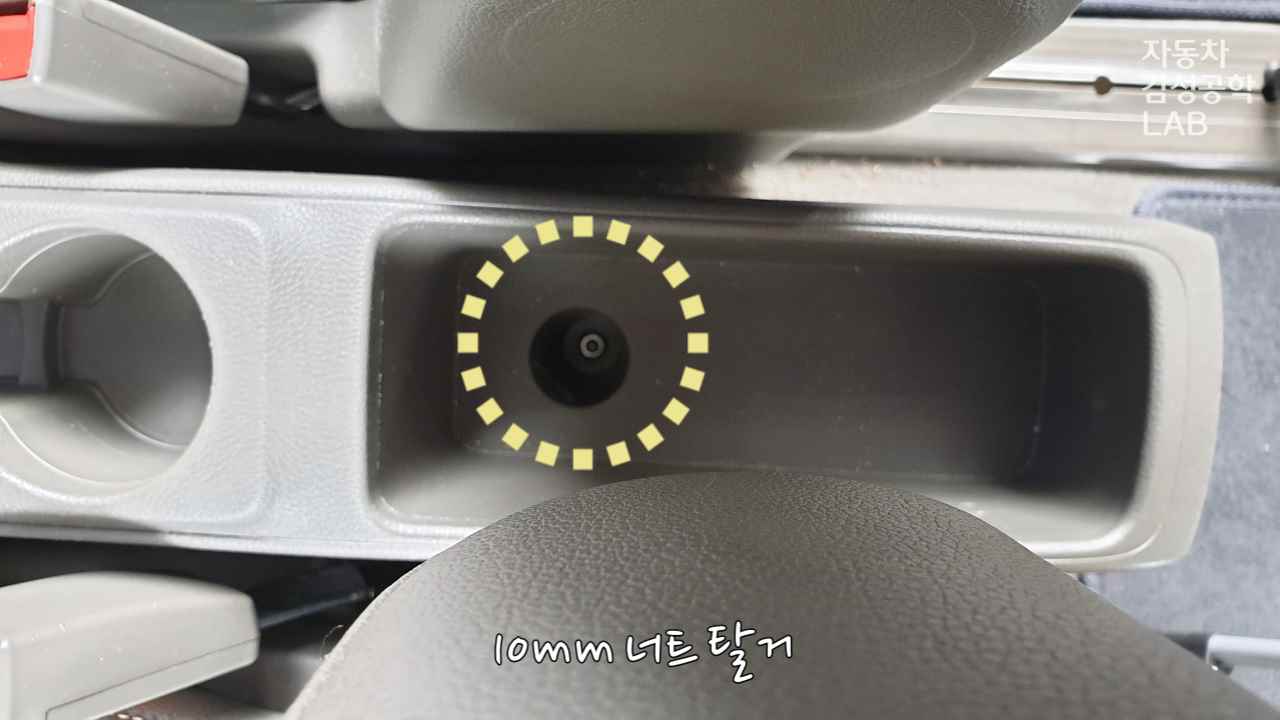 컵홀더 뒤 수납공간의 바닥에 있는 흡음패드를 꺼내면 탈거해야 될 너트가 보입니다.