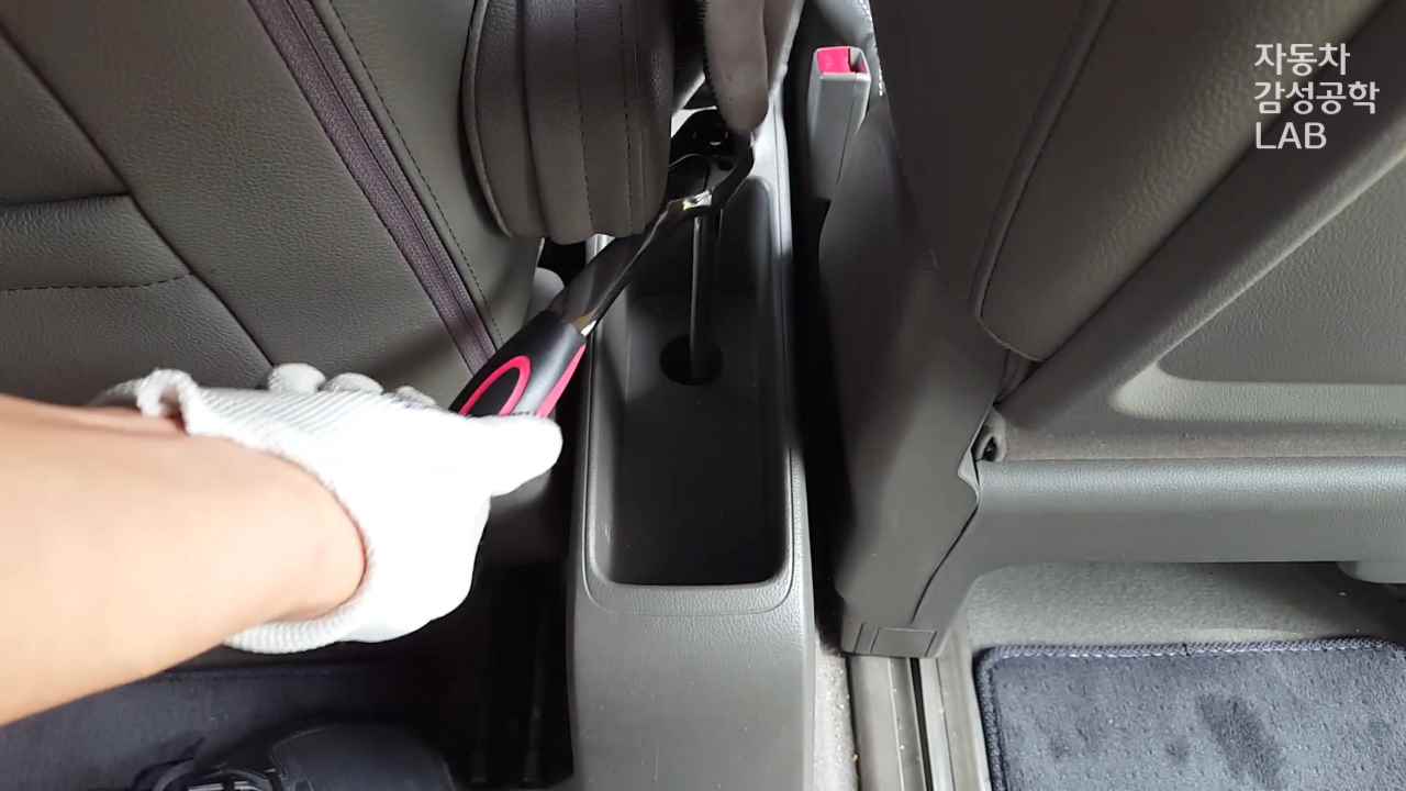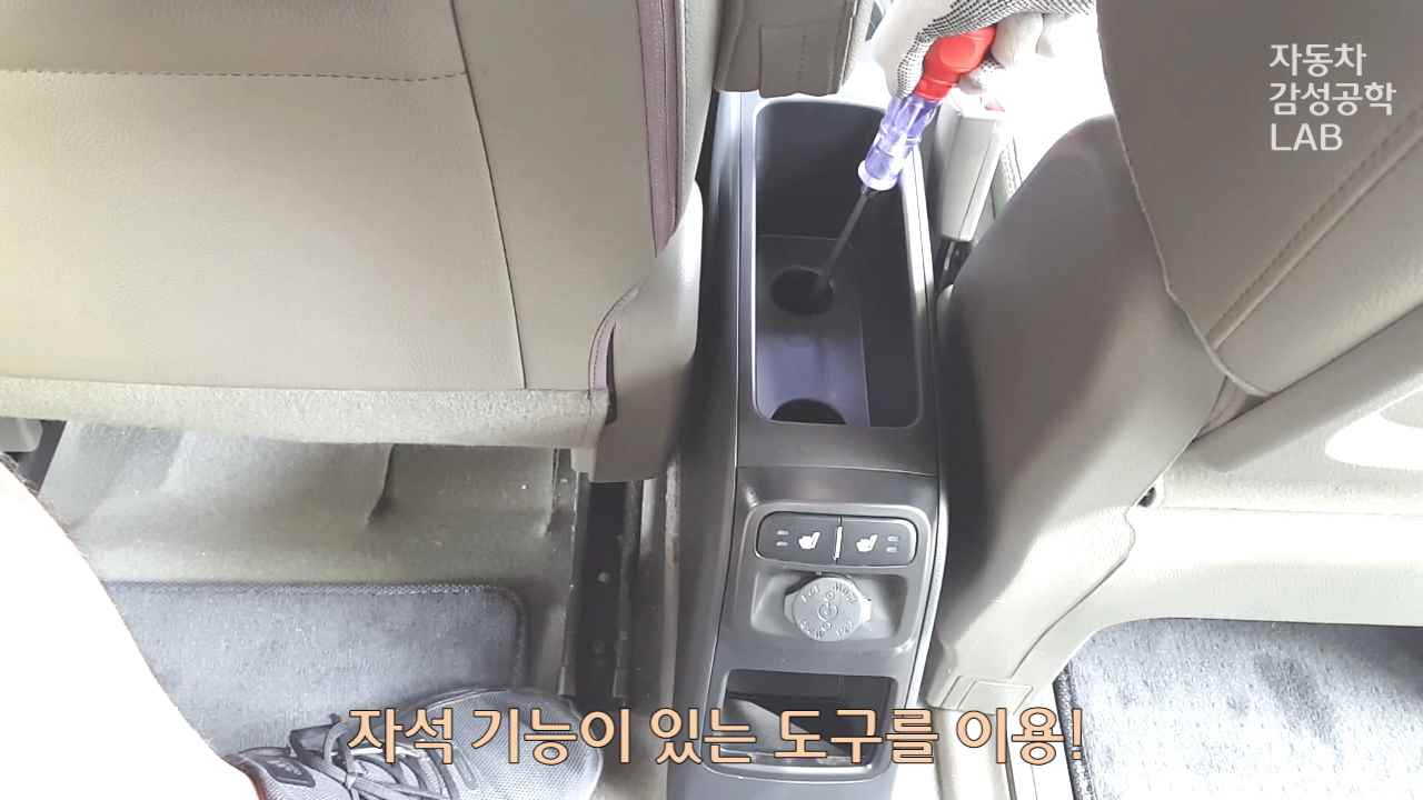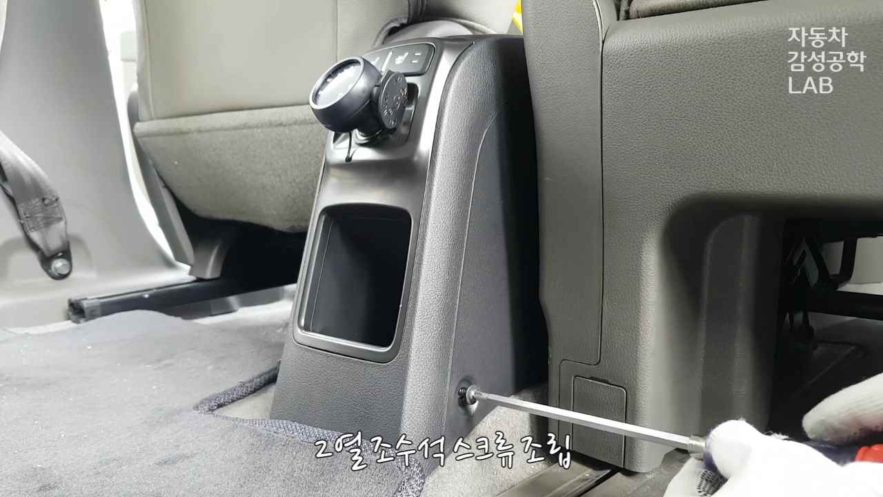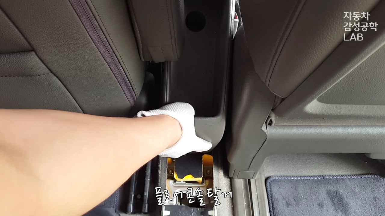 컵홀더 뒤 수납공간의 바닥에 있는 흡음패드를 꺼내면 탈거해야 될 너트가 보입니다.