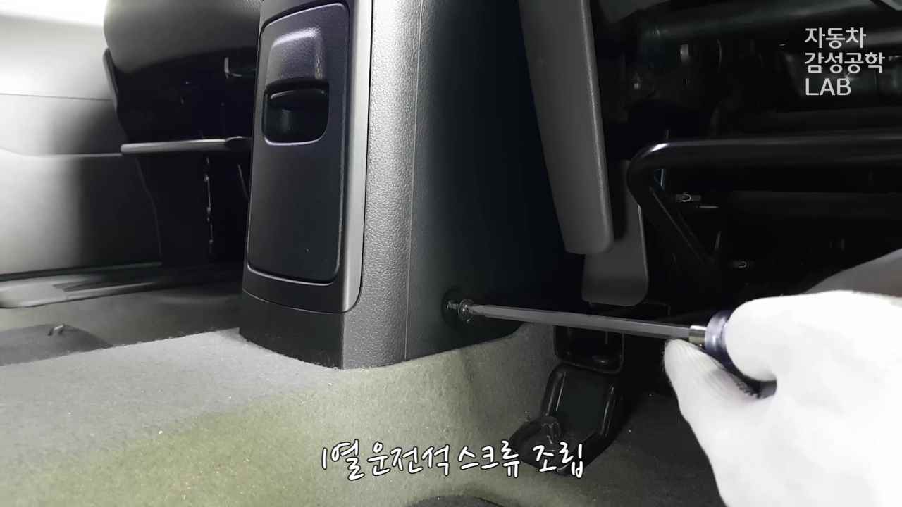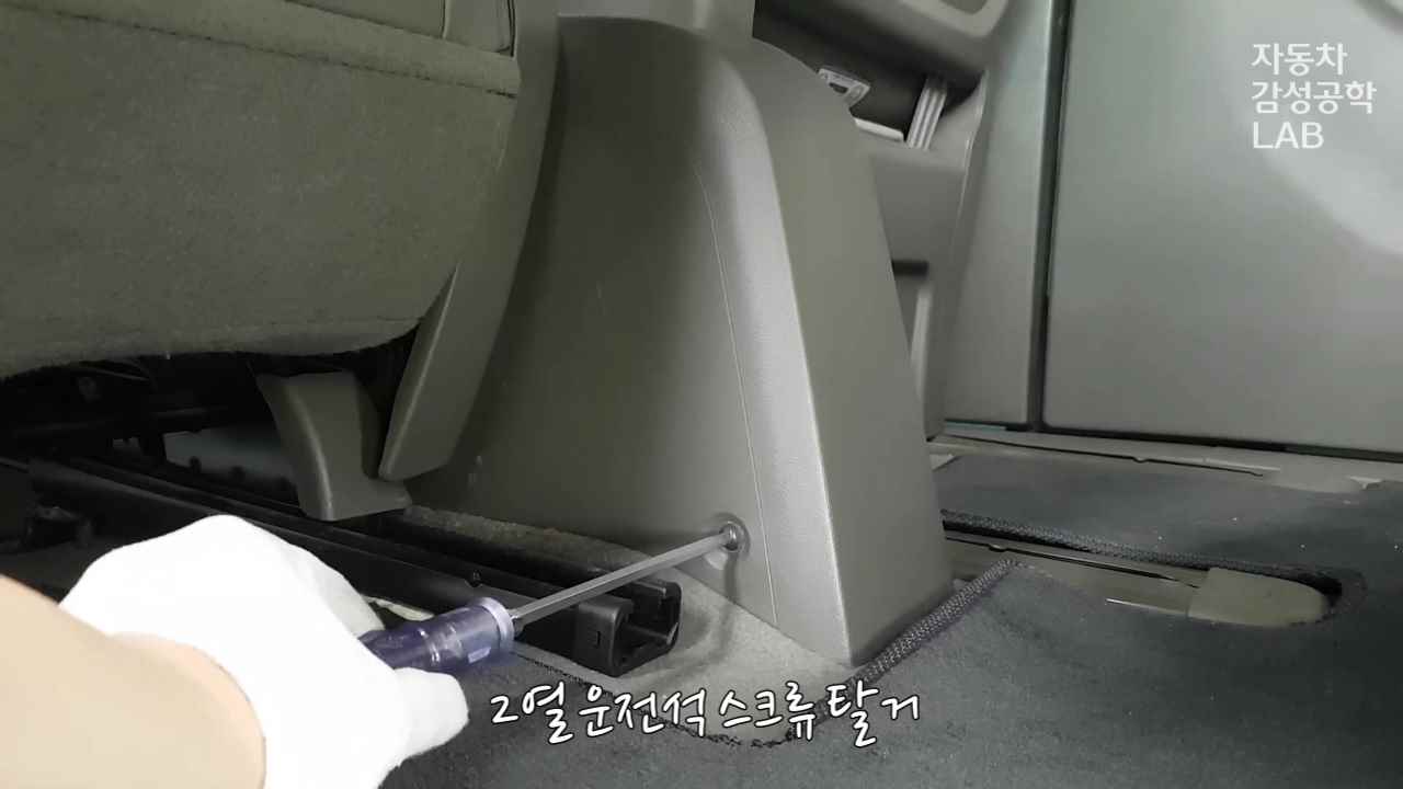 측면 하단의 플로어 콘솔을 고정하고 있는 스크류 4EA를 탈거합니다. 스크류 탈거를 위해 필요 시 시트 위치를 앞, 뒤로 이동시킵니다.