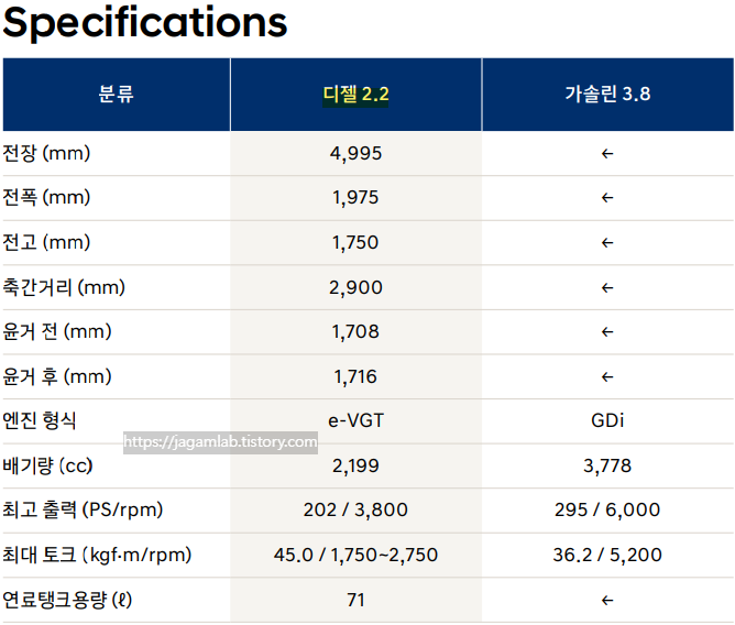 전장 4,995mm, 전폭 1,975mm, 전고 1,750mm 그리고 축간거리(휠베이스) 2,900mm이며 디젤 2.2 엔진과 8단 자동변속기가 조합되어 최고 출력 202마력(@3,800rpm), 최대 토크 45.0kgf·m(@1,750~2,750rpm)를 제공합니다. 서스펜션은 전륜 맥퍼슨 스트럿, 후륜에는 멀티링크가 적용되며 연료탱크 용량은 71L입니다.