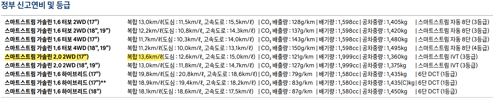 공차 중량은 1,360kg이며 연비는 복합 13.6km/L(도심 12.6km/L, 고속도로 15.0km/L)입니다.