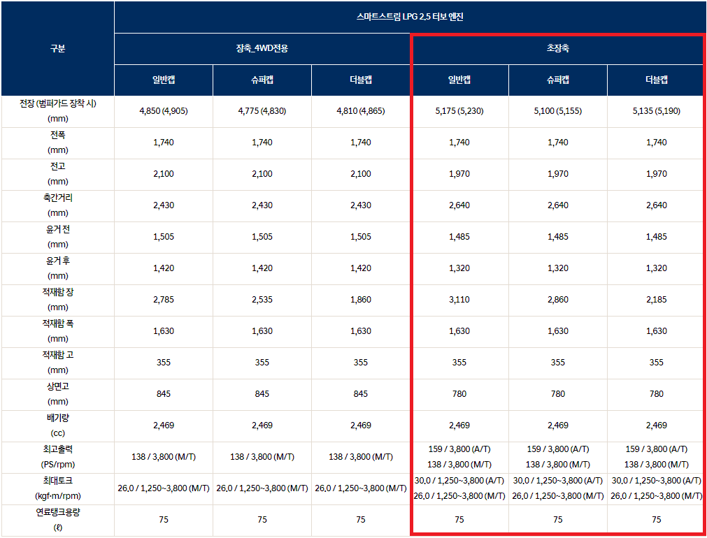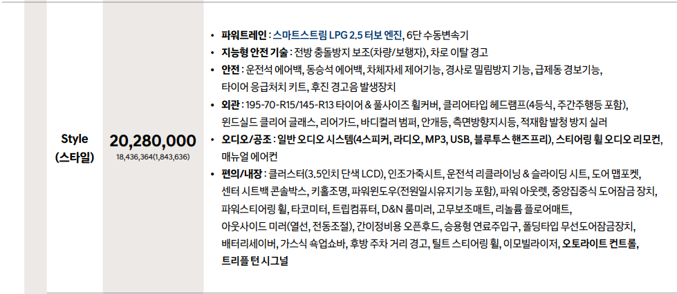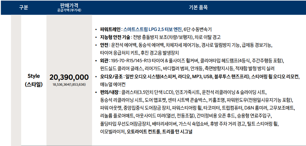 스마트스트림 LPG 2.5 터보 엔진과 6단 수동변속기가 조합되어 최고 출력 138마력(@3,800rpm), 최대 토크 26.0kgf·m(@1,250~3,800rpm)를 제공합니다.