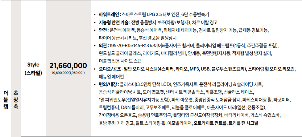 판매 가격이 가장 낮은 트림은 스타일이며 슈퍼캡 2,039만 원, 더블캡 2,160만 원 그리고 일반캡 2,028만 원입니다. 5단 자동변속기 선택 시 113만 원이 추가됩니다.