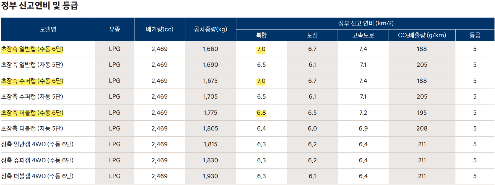 공차 중량은 6단 수동변속기 기준 일반캡 1,660kg, 슈퍼캡 1,675kg, 더블캡 1,775kg이며 공인 연비는 슈퍼캡 복합 7.0km/L(도심 6.7km/L, 고속도로 7.4km/L), 더블캡 복합 6.8km/L(도심 6.7km/L, 고속도로 7.4km/L) 그리고 일반캡 7.0km/L(도심 6.5km/L, 고속도로 7.2km/L)입니다.