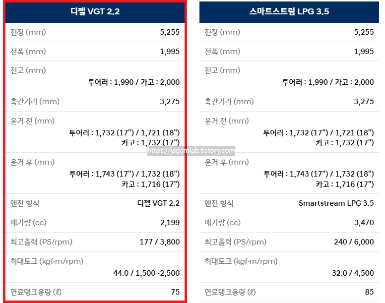 전장 5,255mm, 전폭 1,995mm, 전고 1,990mm 그리고 축간거리(휠베이스)는 3,275mm이며 디젤 VGT 2.2 엔진과 8단 자동변속기가 조합되어 최고 출력 177마력(@3,800rpm), 최대 토크 44.0kgf·m(@1,500~2,500rpm)를 제공합니다. 서스펜션은 전륜 맥퍼슨 스트럿, 후륜에는 멀티링크가 적용되며 연료탱크 용량은 75L입니다.