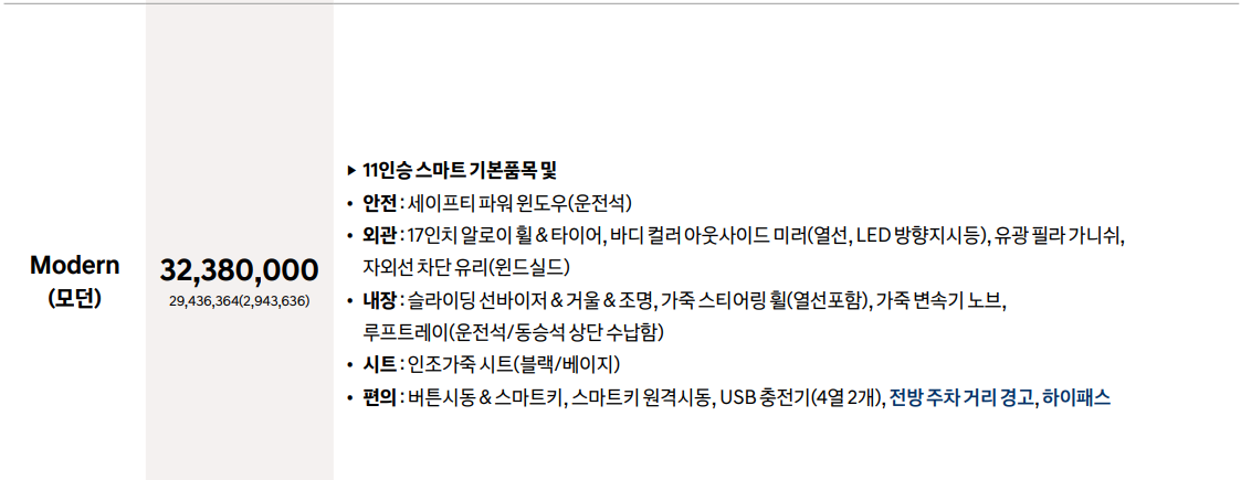 2024 스타리아 투어러 9인승 디젤 2.2 모델은 '모던' 단일 트림이며 판매 가격은 3,238만 원입니다.
