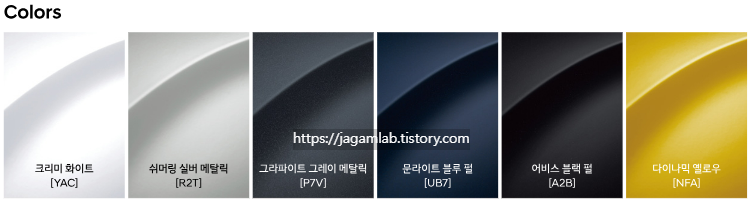크리미 화이트(YAC), 쉬머링 실버 메탈릭(R2T), 그라파이트 그레이 메탈릭(P7V), 문라이트 블루 펄(UB7), 어비스 블랙 펄(A2B), 다이나믹 옐로우(NFA) 유광 컬러 6종 중 선택할 수 있습니다.