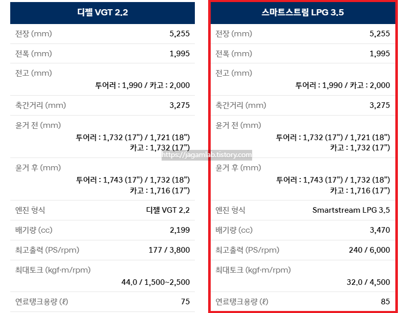 전장 5,255mm, 전폭 1,995mm, 전고 1,990mm 그리고 축간거리(휠베이스)는 3,275mm이며 스마트스트림 LPG 3.5 엔진과 8단 자동변속기가 조합되어 최고 출력 240마력(@6,000rpm), 최대 토크 32.0kgf·m(@4,500rpm)를 제공합니다. 서스펜션은 전륜 맥퍼슨 스트럿, 후륜에는 멀티링크가 적용되며 연료탱크 용량은 85L입니다.