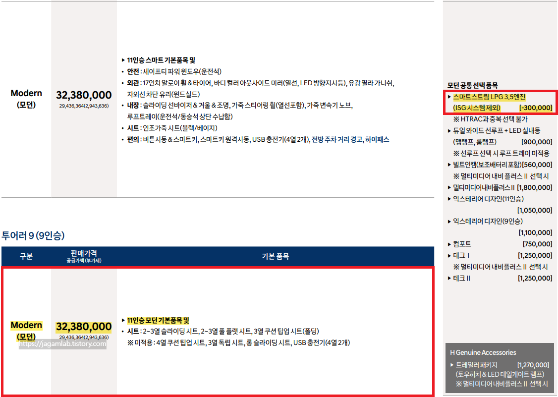 안녕하세요 자감랩입니다. 자감랩에는 '디테일'이 있다~! 이번 포스팅은 2024 스타리아 라운지 9인승 LPG 3.5 모델의 기본 사양 선택 시 가격과 특징에 관한 것입니다. 2024 스타리아