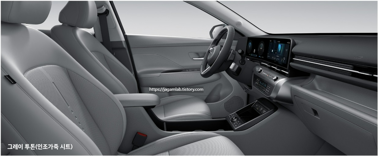 블랙 원톤 또는 그레이 투톤 컬러의 인테리어와 인조가죽 시트가 적용됩니다.