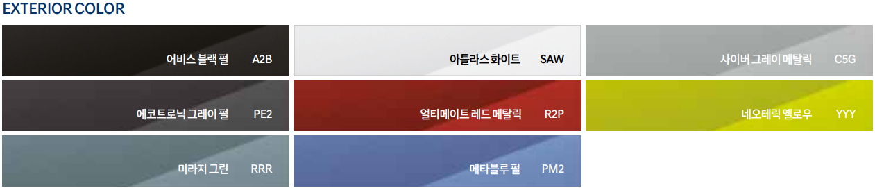 어비스 블랙 펄(A2B), 아틀라스 화이트(SAW), 사이버 그레이 메탈릭(C5G), 에코트로닉 그레이 펄(PE2), 얼티메이트 레드 메탈릭(R2P), 네오테릭 옐로우(YYY), 미라지 그린(RRR), 메타블루 펄(PM2) 유광 컬러 8종 중 선택할 수 있습니다.