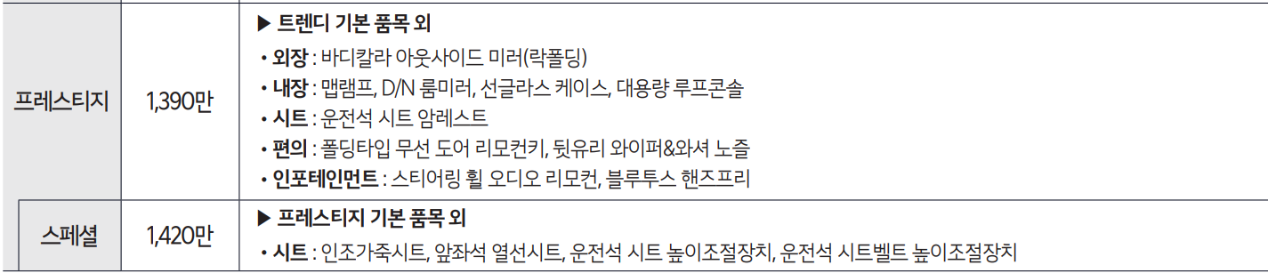 2024 레이 밴 모델은 트렌디, 프레스티지 그리고 프레스티지 스페셜 총 3개 트림이 있으며 판매 가격이 가장 낮은 '트렌디' 트림은 1,340만 원입니다.