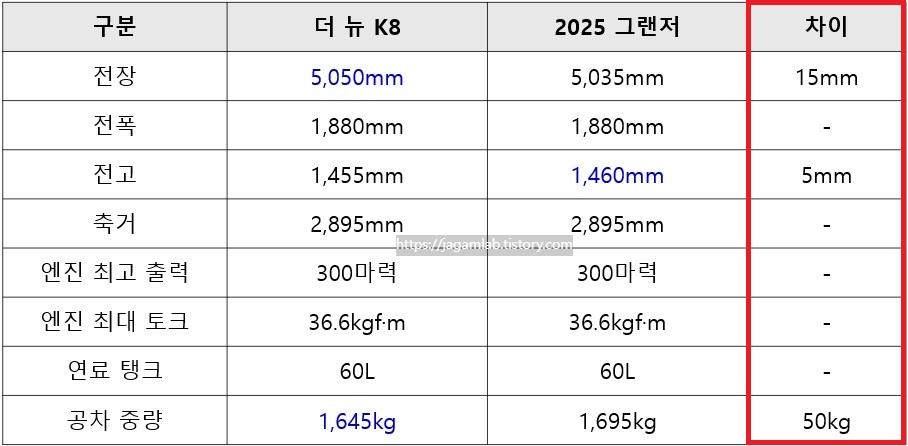 더 뉴 K8 3.5 가솔린 모델은 전장 5,050mm, 전폭 1,880mm, 전고 1,455mm, 축간거리(휠베이스) 2,895mm, 엔진 최고 출력 300마력(@6,400rpm), 엔진 최대 토크 36.6kgf·m(@5,000rpm), 연료 탱크 용량 60L 그리고 공차 중량은 1,645kg(18인치 휠 기준)이며 2025 그랜저 가솔린 3.5 모델은 전장 5,035mm, 전폭 1,880mm, 전고 1,460mm 그리고 축간거리(휠베이스)는 2,895mm, 엔진 최고 출력 300마력(@6,400rpm), 엔진 최대 토크 36.6kgf·m(@5,000rpm) 연료 탱크 용량 60L 그리고 공차 중량은 1,695kg(18인치 휠 기준)입니다.