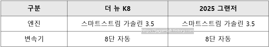 더 뉴 K8과 2025 그랜저 모델 모두 스마트스트림 가솔린 3.5 엔진과 8단 자동변속기 조합입니다.
