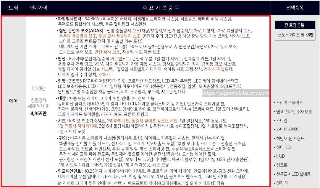 안녕하세요 자감랩입니다. 자감랩에는 '디테일'이 있다~! 이번 포스팅은 소형 RV 전동화 모델인 기아 2025 니로 EV의 기본 사양 선택 시 가격과 특징에 관한 것입니다. 2025 니로 EV