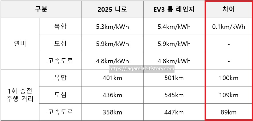 2025 니로 EV 모델은 전비 복합 5.3km/kWh, 도심 5.9km/kWh 고속도로 4.8km/kWh, 1회 충전 주행 거리 복합 401km, 도심 436km, 고속도로 358km이며 EV3 롱 레인지 모델은 전비 복합 5.4km/kWh, 도심 5.9km/kWh 고속도로 4.8km/kWh, 1회 충전 주행 거리 복합 501km, 도심 545km, 고속도로 447km입니다.