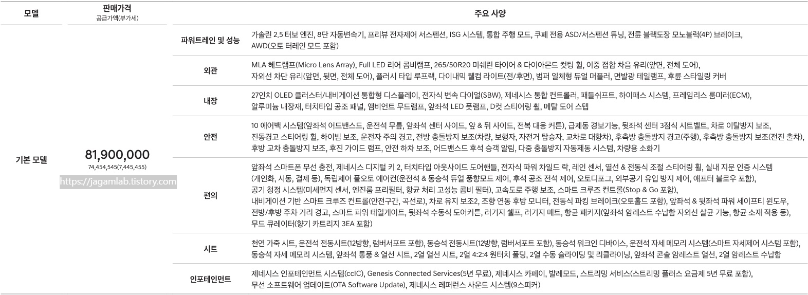 ※제네시스 2024 GV80 가솔린 3.5 터보 기본 사양의 가격과 제원 등 자세한 내용은 아래의 포스트를 참고하세요.