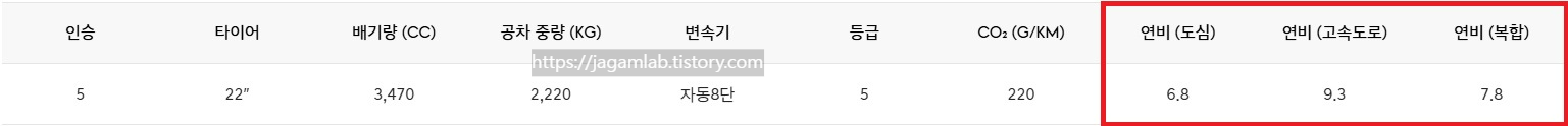 공차 중량은 5인승, 6인승, 7인승 모두 2,220kg이며 공인 연비는 복합 7.8km/L(도심 6.8km/L, 고속도로 9.3km/L)입니다.