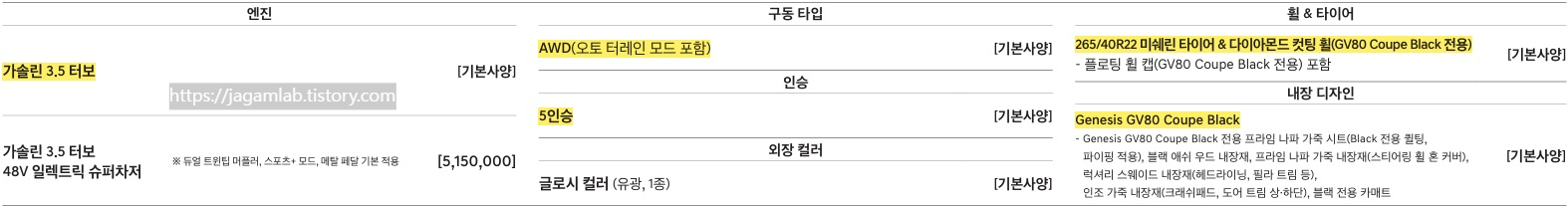 가솔린 3.5 터보 엔진, AWD(오터 터레인 모드 포함), 5인승, 글로시 컬러(유광, 1종), GV80 쿠페 블랙 전용 22인치 다이아몬드 컷팅 휠 그리고 GV80 쿠페 블랙 전용 내장 디자인이 기본 적용됩니다.