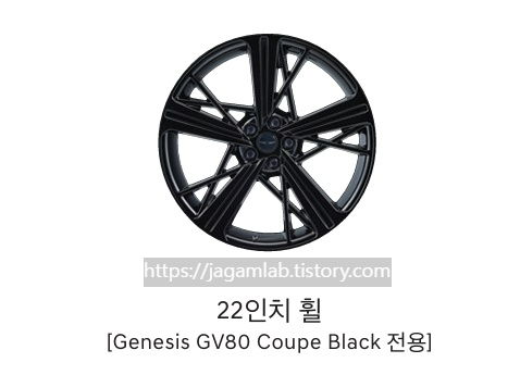 GV80 쿠페 블랙 전용 22인치 다이아몬드 컷팅 휠과 265/40 R22 미쉐린 타이어가 적용됩니다.