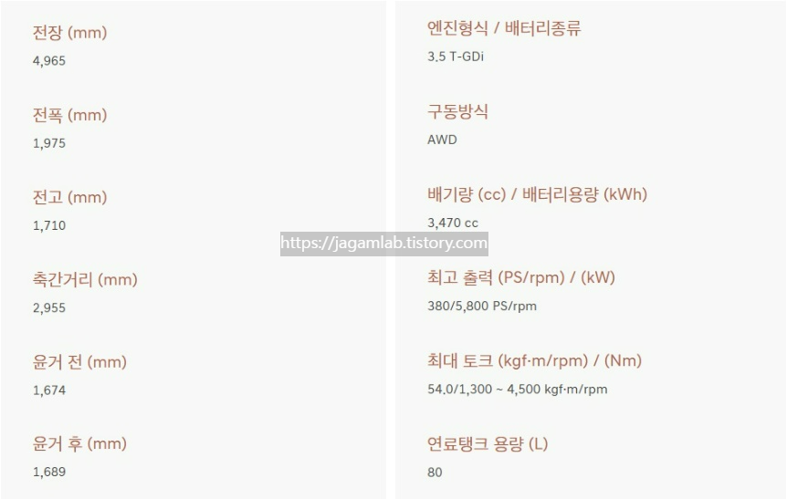 전장 4,965mm, 전폭 1,975mm, 전고 1,710mm 그리고 축간거리(휠베이스)는 2,955mm이며 가솔린 3.5 터보 엔진과 8단 자동변속기가 조합되어 최고 출력 380마력(@5,800rpm), 최대 토크 54.0kgf·m(@1,300~4,500rpm)를 제공합니다. 서스펜션은 전륜 더블 위시본, 후륜에는 멀티링크가 적용되며 연료탱크 용량은 80L입니다.