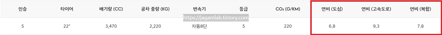 공차 중량은 5인승, 6인승, 7인승 모두 2,220kg이며 공인 연비는 복합 7.8km/L(도심 6.8km/L, 고속도로 9.3km/L)입니다.