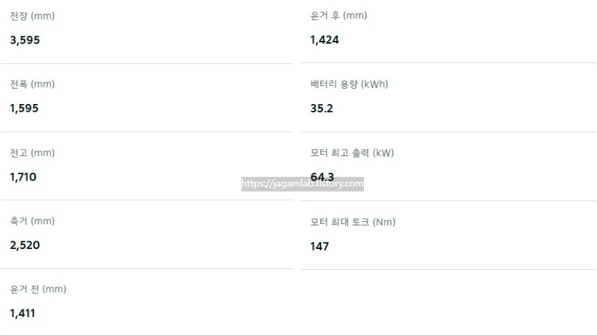 전장 3,595mm, 전폭 1,595mm, 전고 1,710mm 그리고 축간거리(휠베이스)는 2,520mm이며 64.3kW 전기 모터와 35.2kWh 리튬인산철 배터리가 조합되어 최고 출력 64.3kW, 최대 토크 147Nm를 제공합니다. 배터리 충전 시간은 급속충전기 80% 충전 기준 40분, 완속충전기 100% 충전 기준 6시간이 소요됩니다. 서스펜션은 전륜 맥퍼슨 스트럿, 후륜에는 토션빔이 적용됩니다.