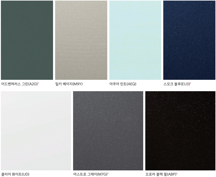 어드벤쳐러스 그린(A2G), 밀키 베이지(M9Y), 아쿠아 민트(AEG), 스모크 블루(EU3), 클리어 화이트(UDD), 아스트로 그레이(M7G), 오로라 블랙 펄(ABP) 유광 컬러 7종 중 선택할 수 있습니다. 직전 모델과 비교 시 어드벤쳐러스 그린(A2G) 컬러가 추가되었습니다.