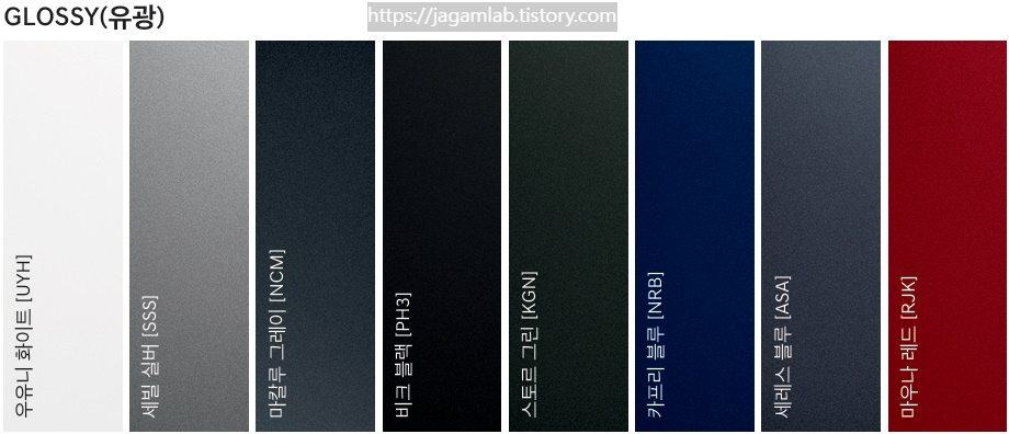 우유니 화이트(UYH), 세빌 실버(SSS), 마칼루 그레이(NCM), 비크 블랙(PH3), 스토르 그린(KGN), 카프리 블루(NRB), 세레스 블루(ASA), 마우나 레드(RJK) 유광 컬러 8종 중 선택할 수 있습니다. 매트(무광) 컬러 4종 선택 시 70만 원이 추가됩니다.