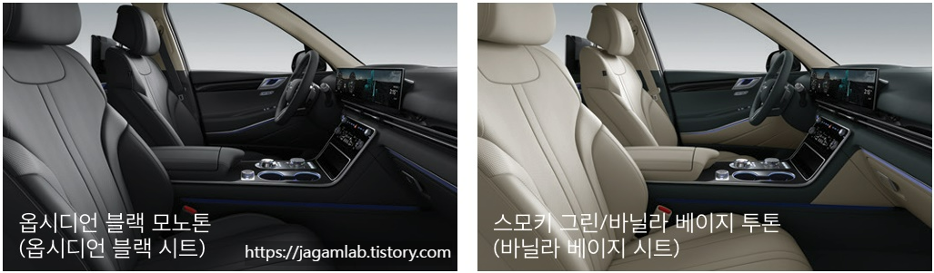 옵시디언 블랙 모노톤(옵시디언 블랙 시트), 스모키 그린/바닐라 베이지 투톤(바닐라 베이지 시트), 스모키 그린/어스 브라운 투톤(어스 브라운 시트) 컬러의 인테리어와 천연가죽 시트가 적용됩니다.