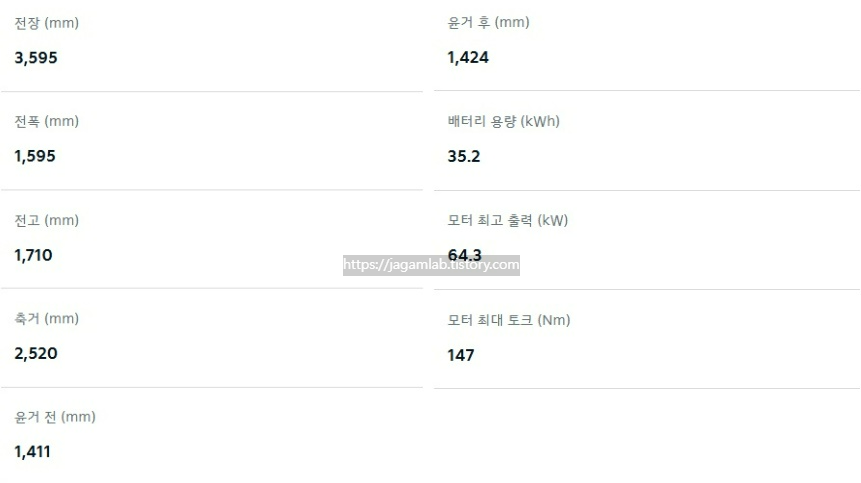 전장 3,595mm, 전폭 1,595mm, 전고 1,710mm 그리고 축간거리(휠베이스)는 2,520mm이며 64.3kW 전기 모터와 35.2kWh 리튬인산철 배터리가 조합되어 최고 출력 64.3kW, 최대 토크 147Nm를 제공합니다. 배터리 충전 시간은 급속충전기 80% 충전 기준 40분, 완속충전기 100% 충전 기준 6시간이 소요됩니다. 서스펜션은 전륜 맥퍼슨 스트럿, 후륜에는 토션빔이 적용됩니다.
