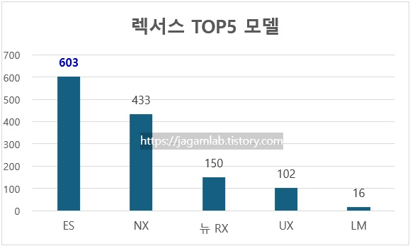 렉서스 TOP5 모델의 9월 판매량은 8월 대비 2.8% 감소하며 1위 ES(603대), 2위 NX(433대), 3위 뉴 RX(150대), 4위 UX(102대) 그리고 5위는 LM(16대)이 차지했습니다. 베스트셀링 모델인 ES는 소폭 증가하며 1위를 유지했습니다. NX와 뉴 UX는 각각 11%와 7.9% 증가하며 2위와 3위를 차지했습니다. UX는 32.5% 감소하며 4위, LM은 80% 감소하며 5위를 차지했습니다.