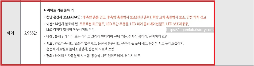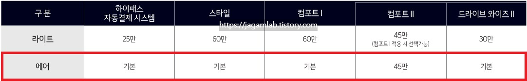 에어 트림 선택 시 하위 트림의 기본 품목과 하이패스 자동결제 시스템, 스타일, 컴포트 Ⅰ, 드라이브 와이즈 Ⅱ 선택 품목이 기본 적용되며 컴포트 Ⅱ 선택 품목의 가격이 추가됩니다. 직전 모델과 비교 시 80만 원 상당의 스타일, 드라이브 와이즈 Ⅱ 품목이 기본 적용되었습니다.
