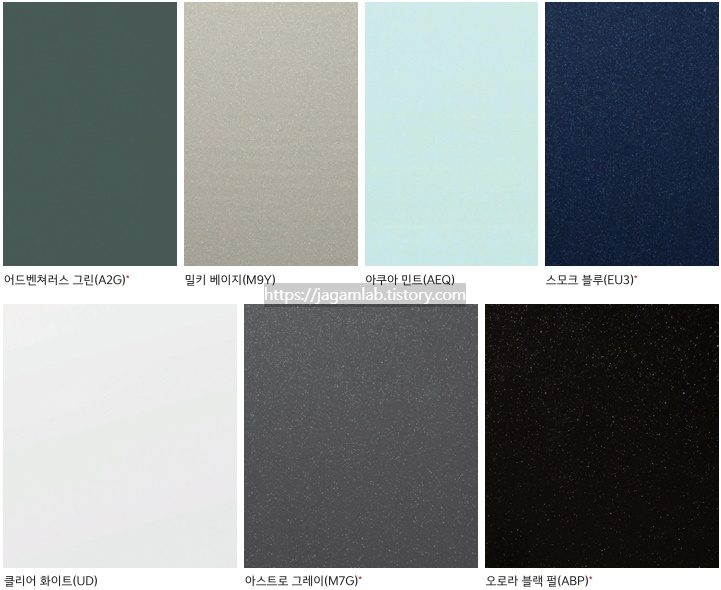 어드벤쳐러스 그린(A2G), 밀키 베이지(M9Y), 아쿠아 민트(AEG), 스모크 블루(EU3), 클리어 화이트(UDD), 아스트로 그레이(M7G), 오로라 블랙 펄(ABP) 유광 컬러 7종 중 선택할 수 있습니다. 직전 모델과 비교 시 어드벤쳐러스 그린(A2G) 컬러가 추가되었습니다.