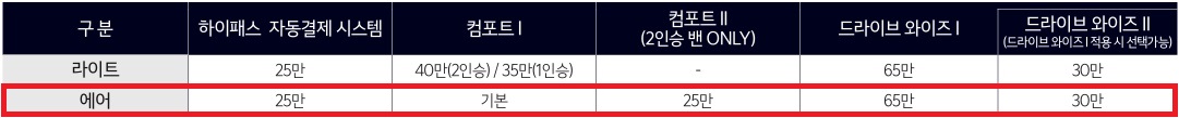 에어 트림 선택 시 하위 트림의 기본 품목과 컴포트 Ⅰ 선택 품목이 기본 적용되며 하이패스 자동결제 시스템, 컴포트 Ⅱ, 드라이브 와이즈 Ⅰ, 드라이브 와이즈 Ⅱ 선택 품목의 가격이 추가됩니다.
