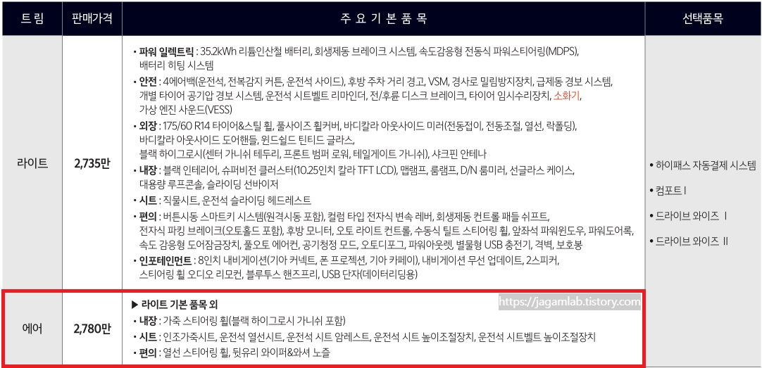 ※2025 레이 EV 풀옵션 사양의 가격과 제원 등 자세한 내용은 아래의 포스트를 참고하세요.