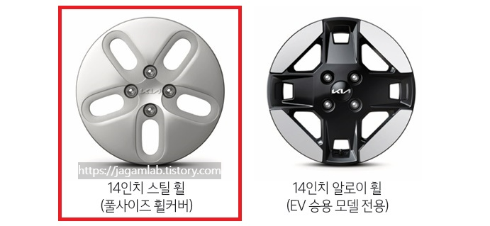 14인치 스틸 휠(풀사이즈 휠 커버)과 175/60 R14 타이어가 적용됩니다.